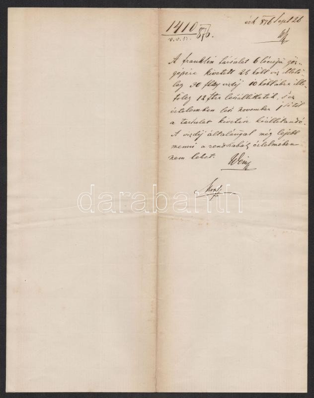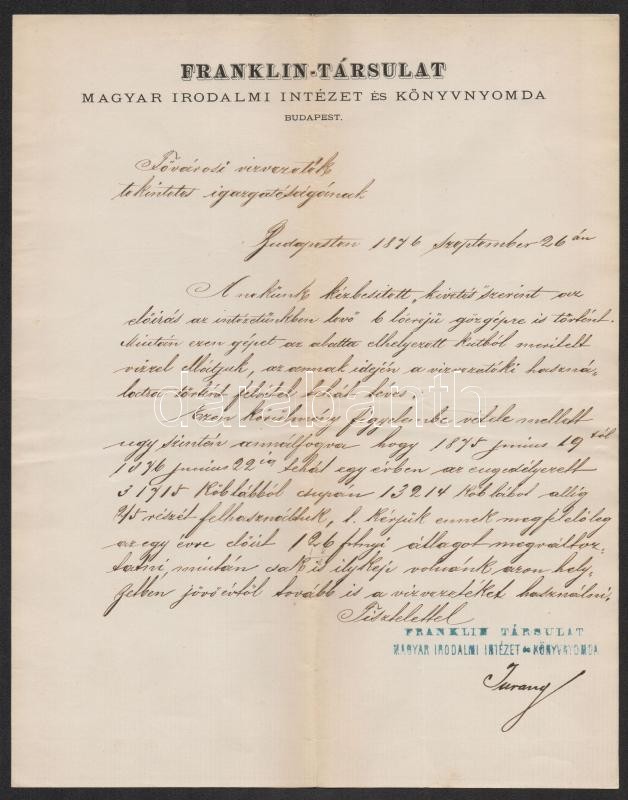 1876 Jurány Vilmos, A Franklin Társulat ügyvezetőjének levele a fővárosi vízvezeték igazgatójának, aláírásával