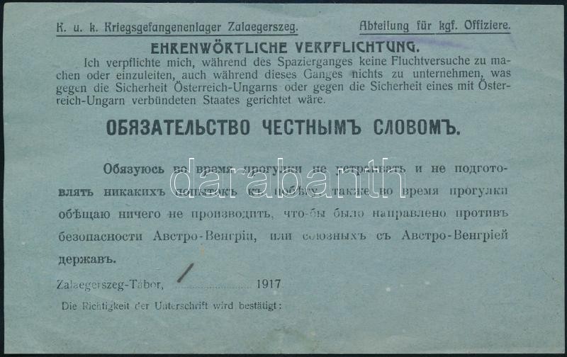 1917 Zalaegerszeg-Tábor, Nyomtatvány tisztek számára német és orosz nyelven arról, hogy nem kísérelnek meg szökést, kitöltetlen
