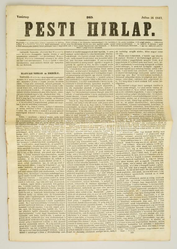 Description: 1843 Pesti Hírlap 1843. július 16. 265. szám, 475-482. p. Kiadja Landerer Lajos, Szerkeszti Kossuth Lajos. Wesselényi Miklós vezércikkével, 482. oldalon fametszetes illusztrációval.