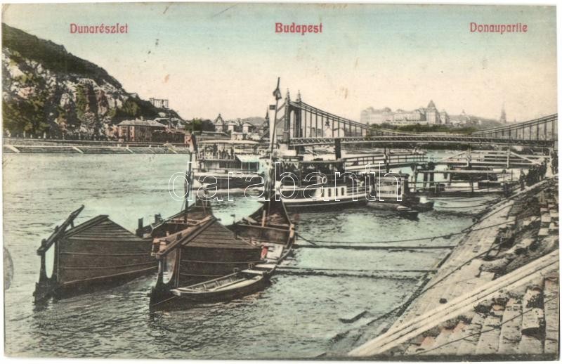 Budapest, Erzsébet híd, Duna részlet, gőzhajók, uszályok + K.u.K. Land...