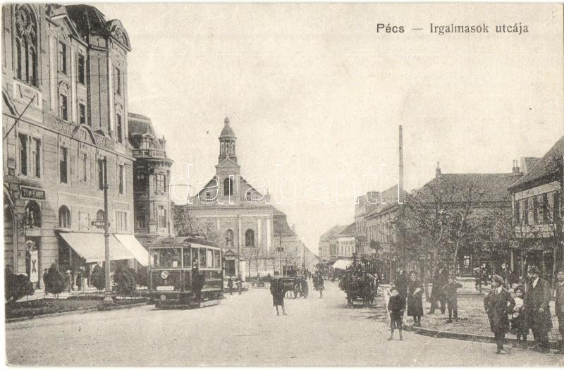 Pécs, Irgalmasok utcája, villamos, üzletek. Karpf Berta kiadása (EK)