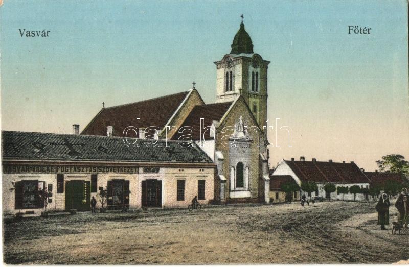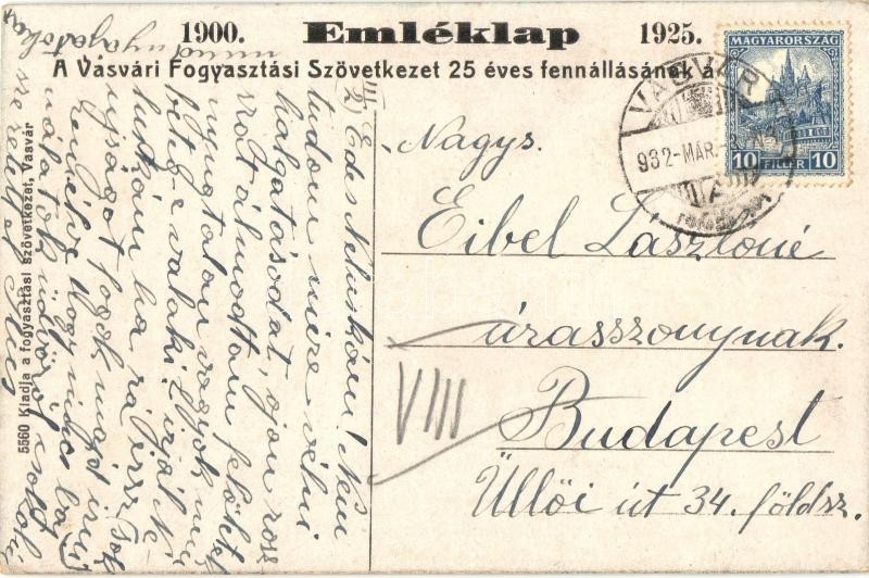 Vasvár, Fő tér, fogyasztási szövetkezet. hátoldalon Emléklap a Vasvári Fogyasztási Szövetkezet 25 éves fennállásának 1900-1925