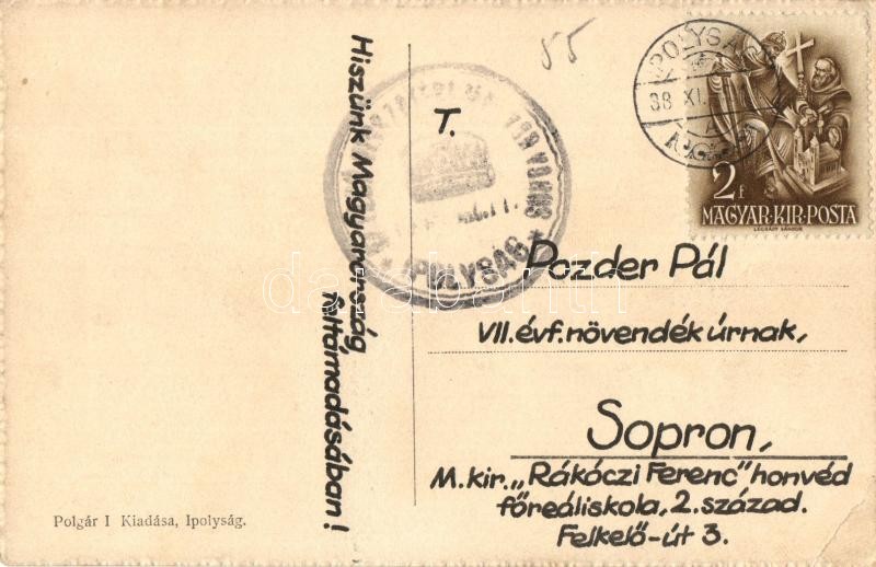 Description: Ipolyság, Sahy; Híd utca, Pannonia szálloda és kávéház, Frischer Adolf üzlete. Polgár I. kiadása / street view, hotel, café, shops + 1938 Ipolyság visszatért So. Stpl. (EK)