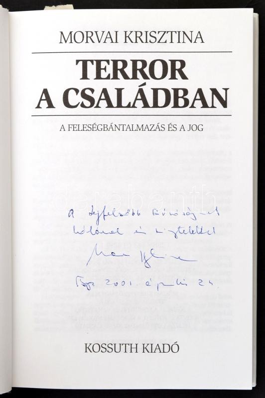 Morvai Krisztina: Terror a családban. A feleségbántalmazás és a jog. Bp.,1998, Kossuth. Kiadói kartonált papírkötés. A szerző által dedikált.