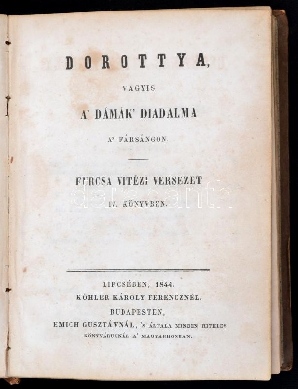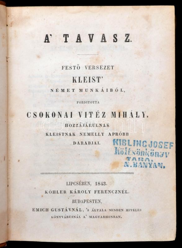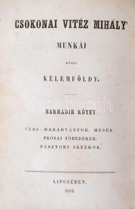 Csokonai Vitéz Mihály munkái I-III. kötet. (Egybekötve.) Közli: Kelemföldy. I.kötet: Tavasz. Lilla. Ódák. Anakreoni dalok. Békaegérharc. II. kötet: Dorottya. Alkalmi versek. Diétai múzsa. III. kötet: Vers-maradványok. Mesék. Prosai töredékek. Pásztori játékok. Lipcse-Bp., 1844-1845, Köhler Károly Ferenc-Emich Gusztáv,(Tauschnitz Bernát-ny. Lipcse), XII+316+XII+356+1+VII+189 p. Korabeli félvászon-kötés, kopottas borítóval, foltos lapokkal, festett lapélekkel.