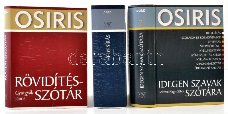 Vegyes könyvtétel, lexikonok, 3 db: Laczkó Krisztina, Mártonfi Attila: Helyesírás. Bp., 2004, Osiris. Magyar Nyelv Kézikönyvtára. Kiadói kartonált papírkötés. Tolcsvai Nagy Gábor: Idegen szavak szótára. Bp., 2007, Oriris. Kiadói kartonált papírkötés. Gyurgyák János: Rövidítés-szótár. Bp., 2005, Osiris. Kiadói papírkötés.