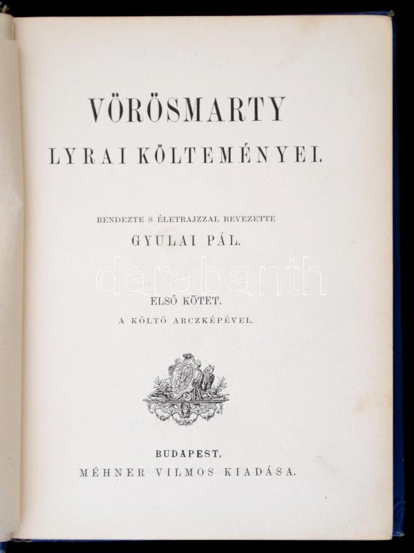 Vörösmarty Mihály Lyrai Költeményei I. kötet. Bp., é.n., Méhner Vilmos. Kiadói aranyozott, festett, illusztrált egészvászon-kötés, aranyozott lapélekkel, hiányzó elülső szennylappal, kis kopásokkal, de alapvetően jó állapotban.
