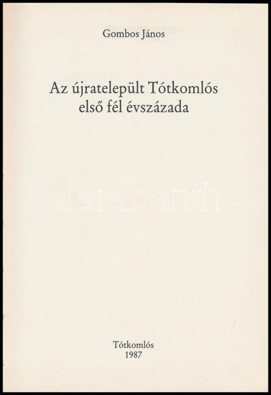 Gombos János: Az újratelepült Tótkomlós első fél évszázada. Tótkomlós, 1987, Tótkomlós Nagyközségi Tanács Végrehajtó Bizottsága. Kiadói kartonált papírkötés, kiadói kissé szakadozott papír védőborítóban. Megjelent 1000 példányban.