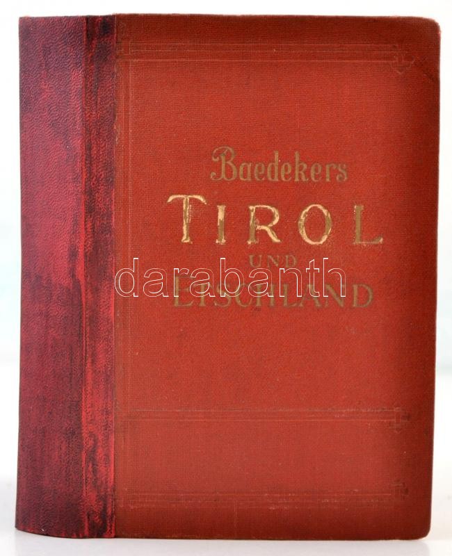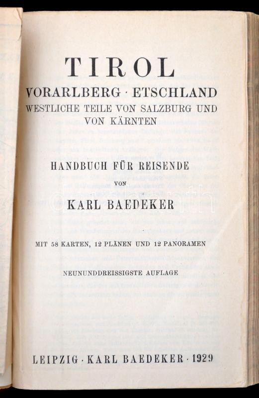 Karl Baedeker: Tirol, Voralberg, Etschland. Westliches teile von Salzburg, und von Kärenten. Handbuch für Reisiende. Leipzig, 1929, Verlag von Karl Baedeker, LVI+556 p. 39. kiadás. Kiadói aranyozott egészvászon kötés, javított gerinccel, festett lapélekkel, térképekkel illusztrálva. / Linen binding, with repaired spine, in German language.