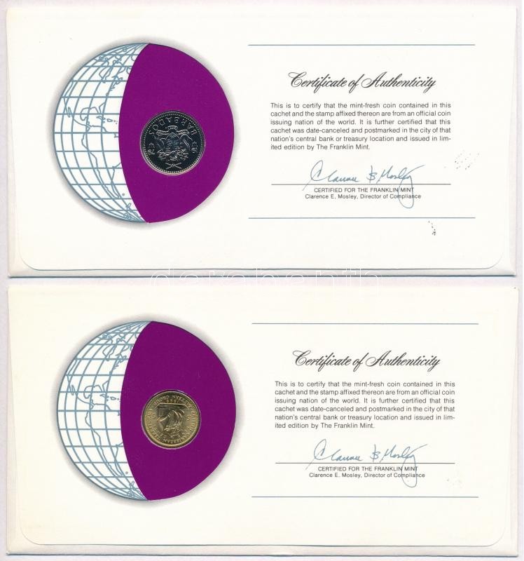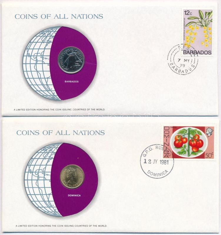 Description: Barbados 1979. 25c + Dominika 1965. 5c mindkettő "COINS OF ALL NATIONS" borítékban, bélyeggel és bélyegzéssel T:1,1-