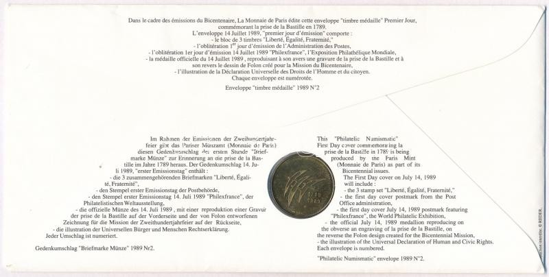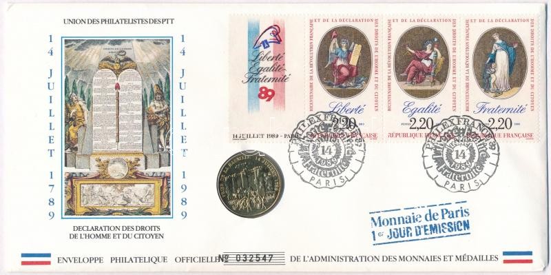 Description: Franciaország 1989. "A Bastille ostroma" aranyozott fém emlékérem sorszámozott borítékban, első napi bélyegzővel és bélyegekkel (26mm) T:1-
