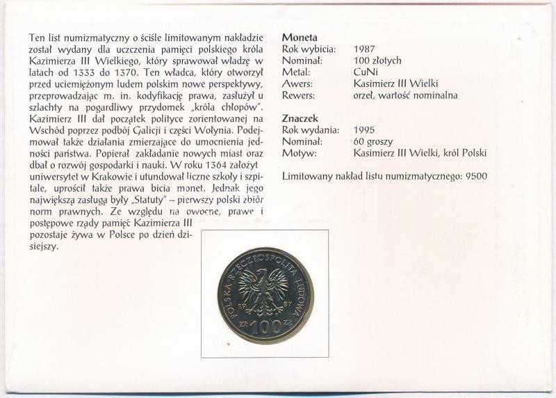 Poland 1987MW 100 Zlotych Cu-Ni "Kazimierz III" in numbered envelope with stamps C:2