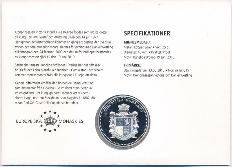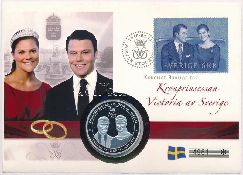 Svédország 2010. "Viktória koronahercegnő esküvője" ezüstözö... https://www.darabanth.com/en/306-Online-auction/306.0/Numismatics/Envelopes-with-Coins-and-Banknotes~200004/Svedorszag-2010-Viktoria-koronahercegno-eskuvoje-ezustozott-Cu-emlekerem-sorszamozott~II1652724
