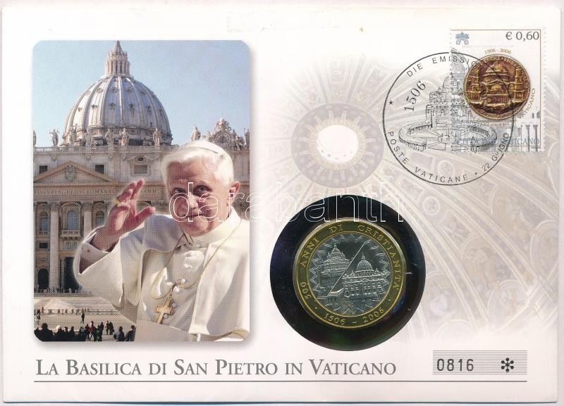 Description: Vatikán 2006. "500 éves a Szent Péter-bazilika" bimetál emlékérem sorszámozott borítékban, bélyeggel és bélyegzéssel (35mm) T:1