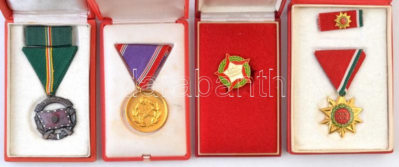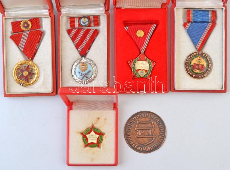 Description: 10db-os vegyes magyar szocialista jelvény és kitüntetés tétel, közte "Honvédelmi Érdemérem 35 év" mellszalagon, eredeti dísztokban, "A Haza Fegyveres Szolgálatában 20 év" mellszalagon, szalagsávval eredeti dísztokban T:2