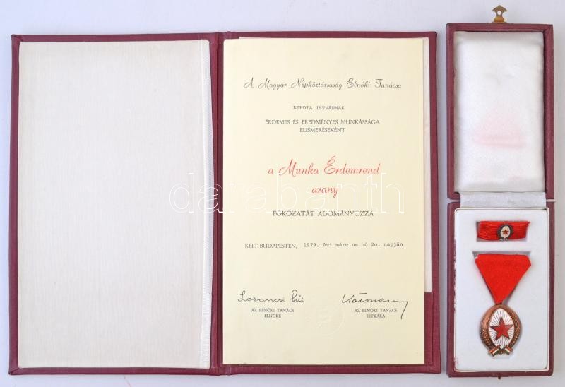 1979. "Munka Érdemrend" arany fokozatának adományozói okirata + 1985. "Munka Érdemrend" bronz fokozata, Br zománcozott kitüntetés mellszalaggal, szalagsávval és miniatűrrel dísztokban T:1-
