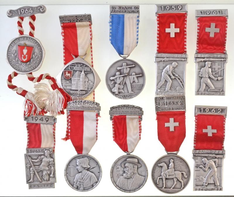 Svájc 1949-1968. 10db-os jelvény tétel, közötte lövész díjérem illetve tematikus jelvénysorozatok (Svájci foglalkozások", "Svájci népviseletek") darabjai, sok "HUGUENIN" gyártói jelzéssel T:1-,2 Switzerland 1949-1968. 10pcs of badges among them shooting contest award and pieces of thematic badge series (Der Wehrhafte Schweizer and der Arbeit", "Die Schweizer-Trachten"), many with "HUGUENIN" makers mark C:AU,XF