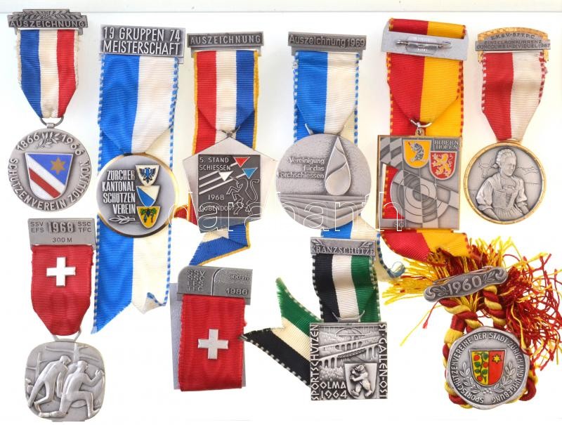 Svájc 1964-1986. 10db-os jelvény tétel, közötte több lövész díjérem, sok darab "HUGUENIN" gyártói jelzéssel T:1-,2 Switzerland 1964-1986. 10pcs of badges among them shooting contest awards, many with "HUGUENIN" makers mark C:AU,XF