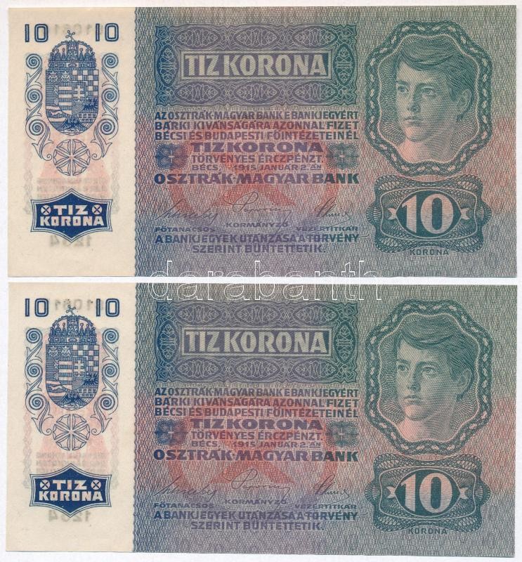 1915. 10K (2x) mindkettő piros függőleges "DEUTSCHÖSTERREICH" felülbélyegzéssel, sorszámkövetők T:II-,III