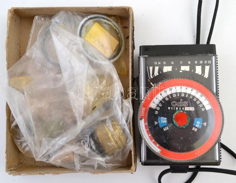 Vegyes fényképező kellék tétel: 3 db régi fénymérő, köztük Zeiss Ikon, különféle szűrők