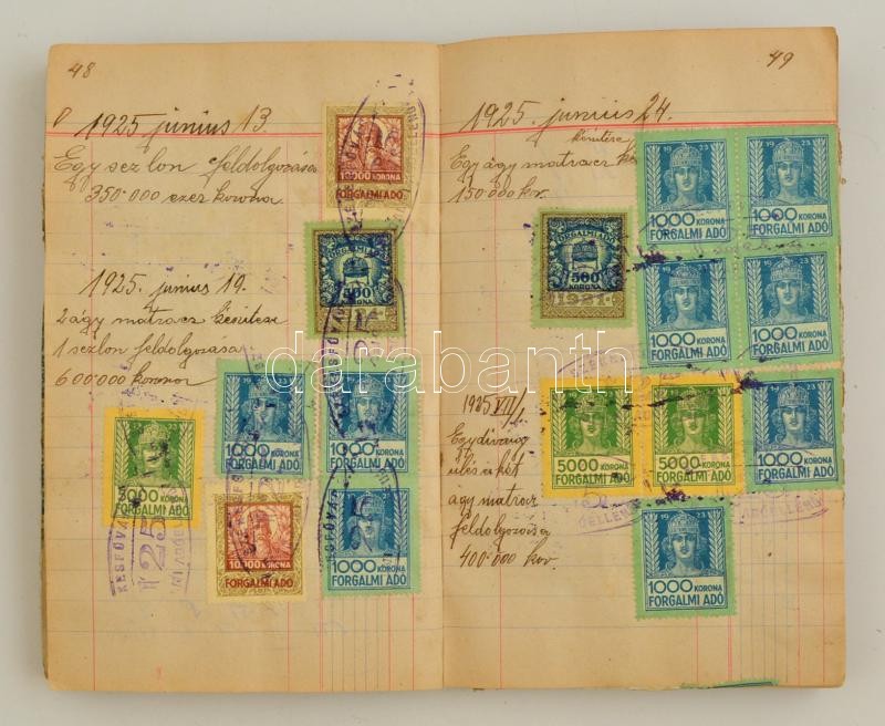 1923-1934 Fejes Viktor kárpitosmester (Bp. VI. Diós u. 2.) forgalmi adókönyve 679 db ép bélyeggel (a 88. p-ig), 192 p.