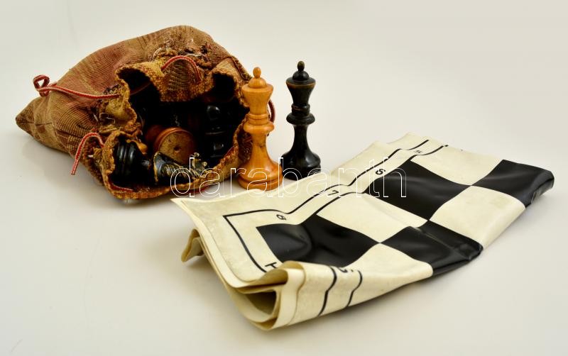 Versenysakk, kopott vászon tábla, figurák szütyőben, 44×47 cm