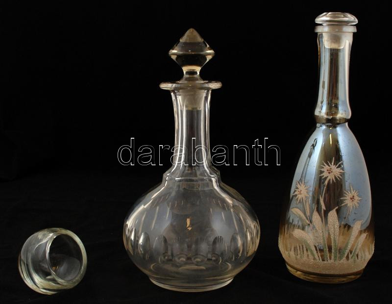 2 db kiöntő, dugóval, az egyik havasi gyopár díszítéssel, jelzés nélkül, az egyiken nagyon apró csorbákkal, m: 23,5 ill. 34 cm + dekoratív hamutartó, jelzés nélkül, csorbákkal, m: 7 cm