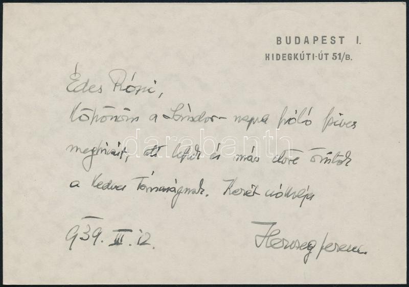 1939 Herczeg Ferenc (1863-1954) személyes hangú köszönő levele Hegedüs... https://www.darabanth.com/en/306-Online-auction/306.0/Other-collectibles/Historical-documents-manuscripts~100020/1939-Herczeg-Ferenc-1863-1954-szemelyes-hangu-koszono-levele-Hegedus-Rozsa-Hegedus-Sando~II1657607