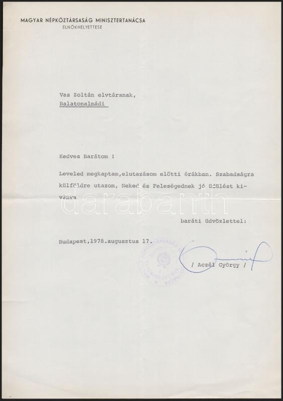1978 Aczél György (1917-1991) kommunista politikus saját kézzel aláírt levele Vas Zoltán (1903-1983) író, 56-os államminiszter részére