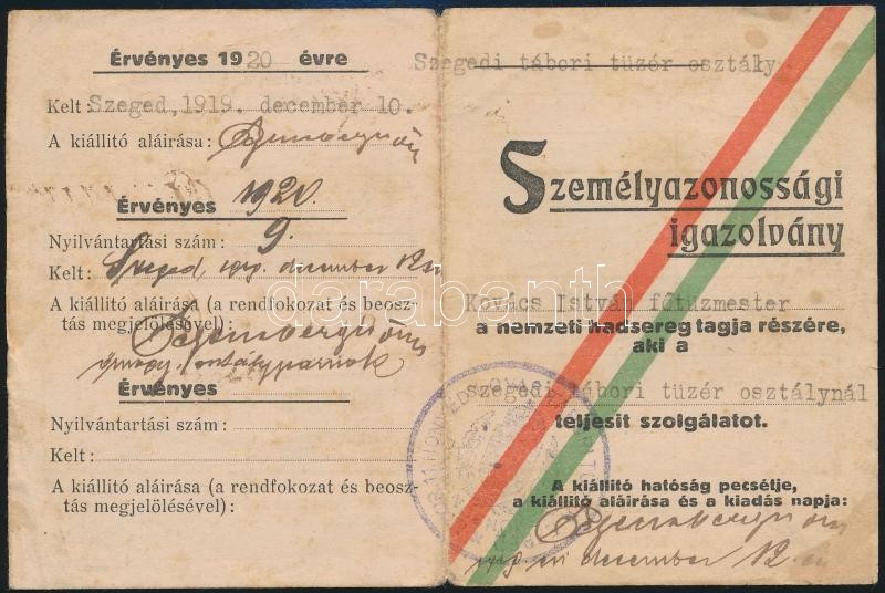 1919 Személyazonossági igazolvány a nemzeti hadsereg főtűzmester tagja...