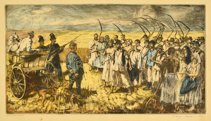 Breznay József (1916-2012)-Mácsai István (1922- 2005): Aratósztrájk. Színezett rézkarc, papír, jelzett, 29×52 cm