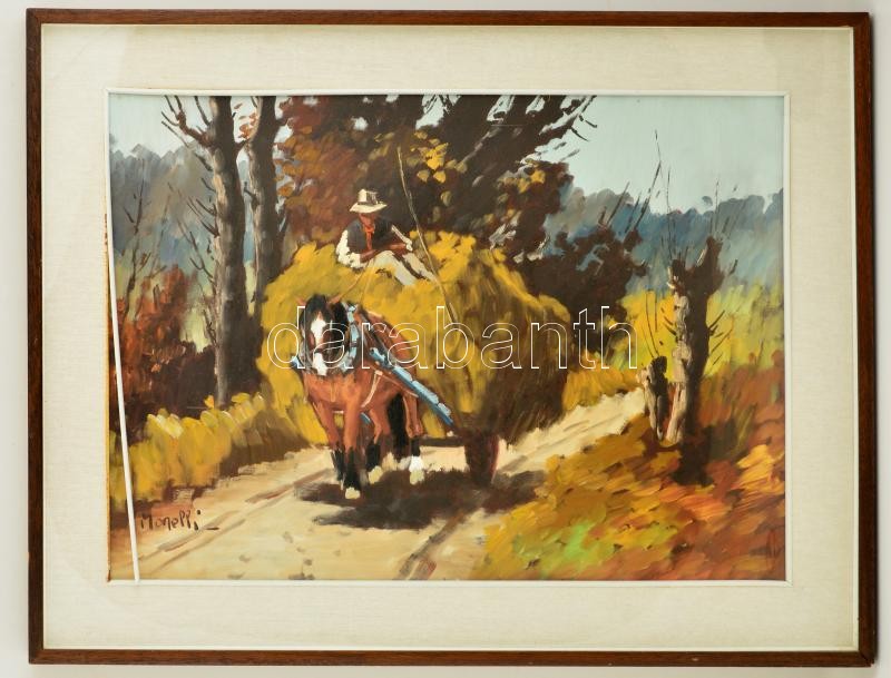 Monelli jelzéssel: Hazafelé. Olaj, vászon, üvegezett keretben, 50×68 c...