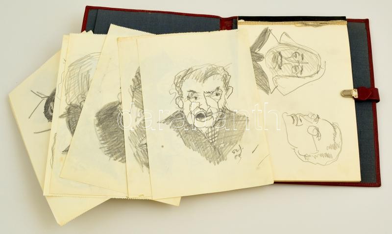 Szőnyi Jenő (1902-?): 8 db, nagyrészt jelzett karikatúra 16x22 cm Ceruza, papír, + vázlatfüzete bőr tokban