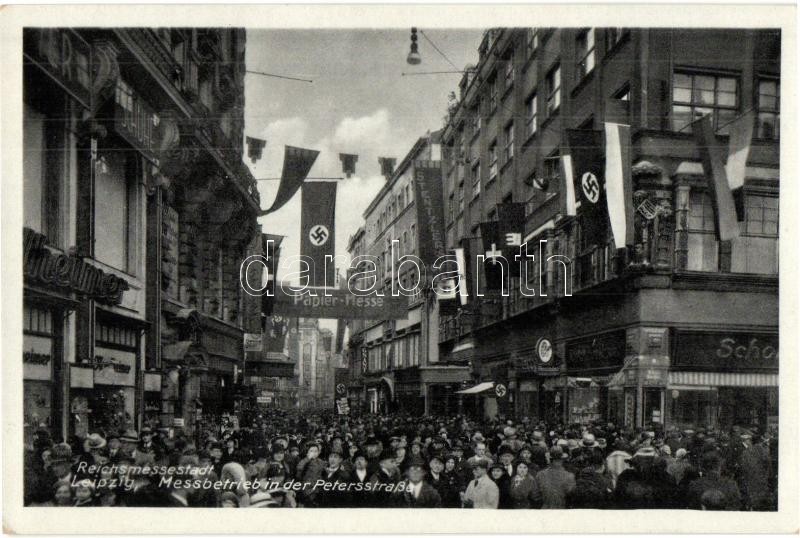 Leipzig, Reichsmesserstadt, Messbetrieb in Peterstrasse / NS flags, swastika, So. Stpl