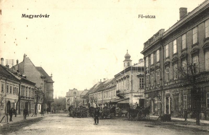 Mosonmagyaróvár, Magyaróvár; Fő utca, Központi szálloda, szekerek, pál...