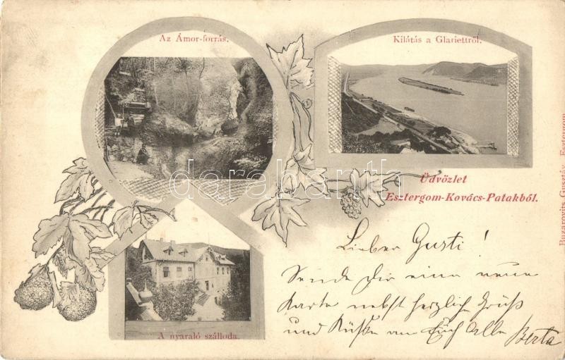 1899 Kovácspatak, Esztergom, Kovacov; Ámor forrás, kilátás a Glariettről, nyaraló szálloda, Buzarovits Gusztáv kiadása / spring, hotel, floral Art Nouveau