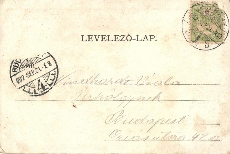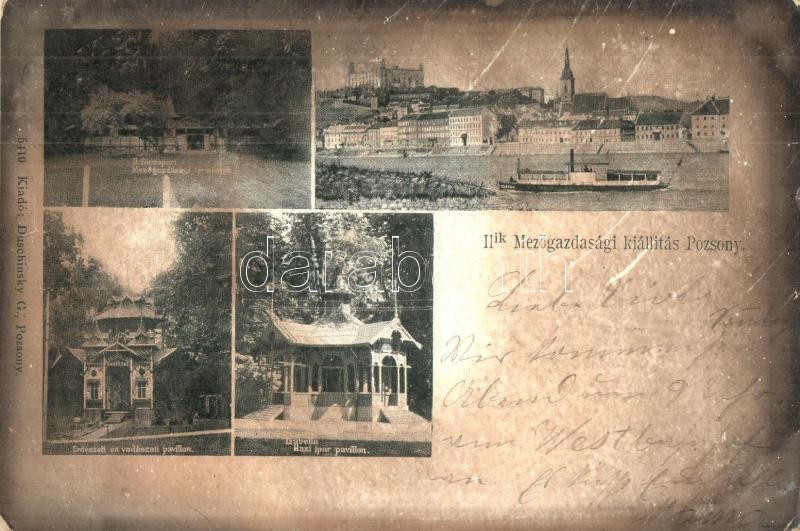 1902 Pozsony, Pressburg, Bratislava; Második Mezőgazdasági kiállítás, erdészeti és vadászati pavilon, Izabella házi ipar pavilon, Szamos monitorhajó, vár. Duschinsky G. kiadása / 2nd National Agricultural Exposition, hunting pavilion, cottage industry pavilion, river guard ship, castle (felületi sérülés / surface damage)