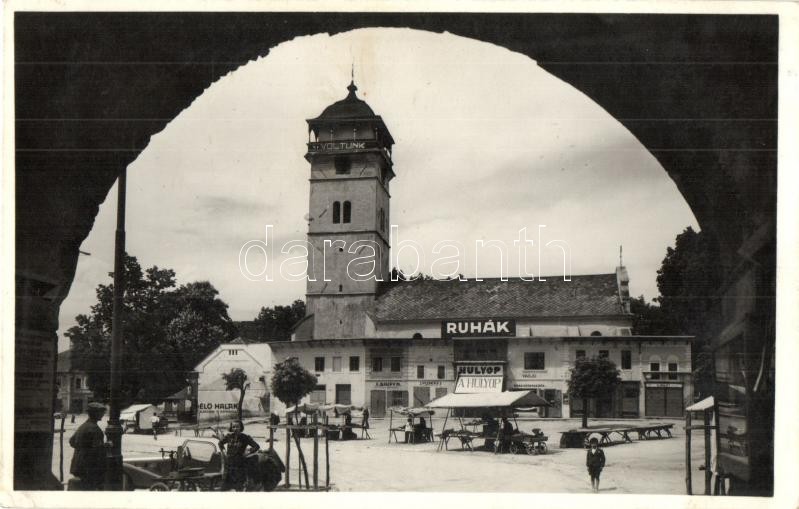 Rozsnyó, Roznava; Premontrei templom, Hulyop, Varjú, Újházy, F. Baffy N. és Puskás J. üzlete, piac / church, shops, market