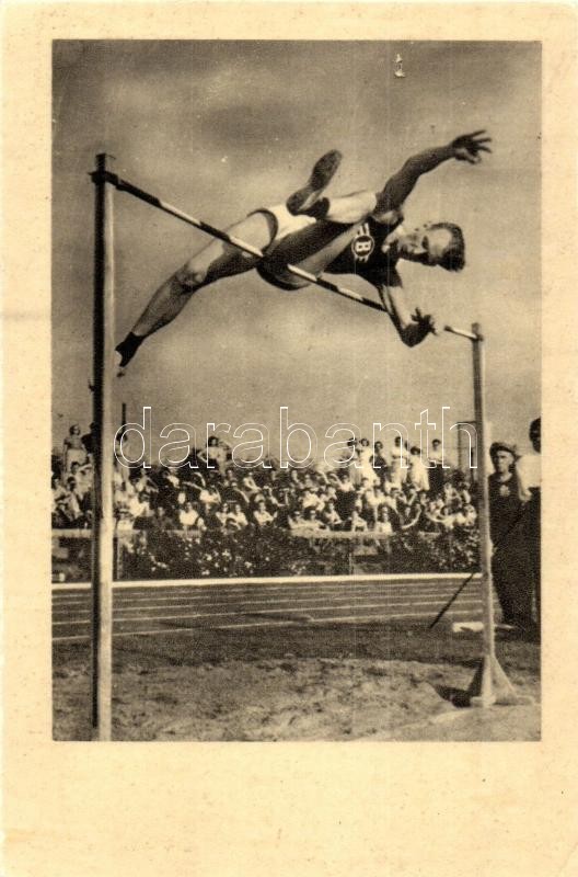 Magasugrás. Bodó Árpád (BEAC) ollózó stílusa légmunka közben lábváltás. Képzőművészeti Alap Kiadóvállalat / Hungarian high jumper
