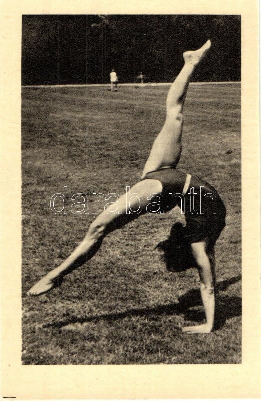 Description: Talajtorna. Korondi Margit olimpiai bajnok tornász kézenálláson árfordul egylábas hídon át. Képzőművészeti Alap kiadása / Hungarian gymnast olympic champion