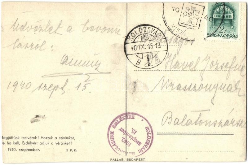 Erdélyi részek visszacsatolásának emlékére / Transylvania, irredenta propaganda, "vissza" So. Stpl s: Németh N. (vágott / cut)