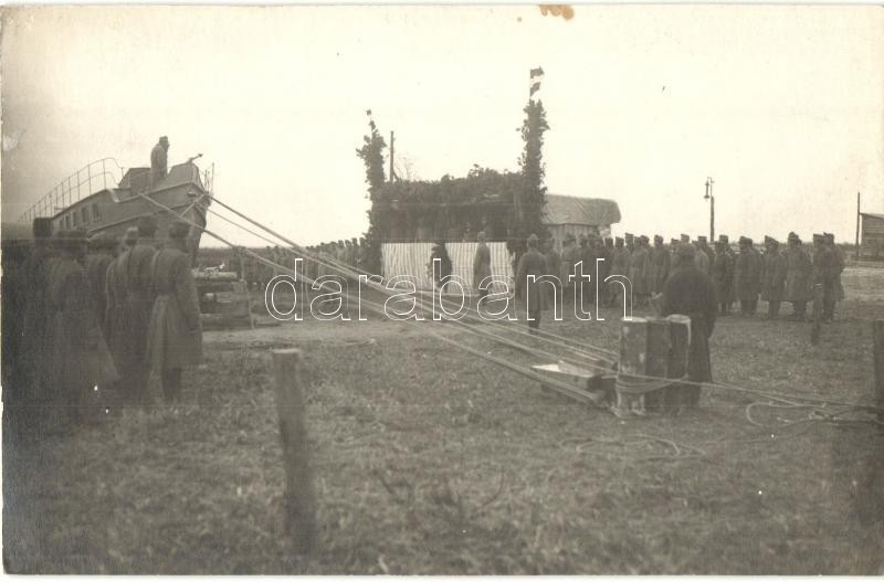 Description: Kaiser, M. kir. Folyamőrség motorcsónakjának vízre bocsájtási ünnepsége még a szárazföldön, Dunai Flottilla / Donau Flottille / Hungarian Danube Fleet, launching ceremony of a river guard motorboat, photo