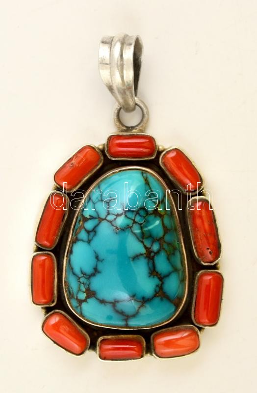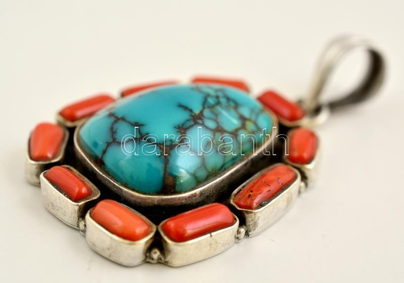 Türkizzel és korallal díszített ezüst(Ag) medál, jelzett, 3,5x3 cm, bruttó: 16,5 g