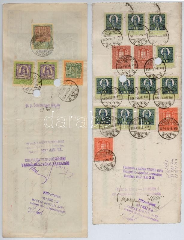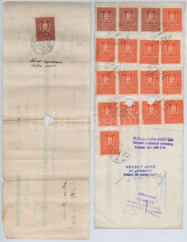 Budapest 1932-1927. 10db-os vegyes váltó tétel, mind kitöltött vagy félig kitöltött, váltóbélyegekkel, legtöbb bélyegzésekkel és pecsétekkel, mind lyukasztással érvénytelenítve, benne "Vecsey Pál okl. Gépészmérnök Budapest, VIII. Kisstáció-utca 11", "Magyar-Olasz Bank Terézkörúti fiókja", "p.p. Schlesinger Alajos" bélyegzések T:III,III-