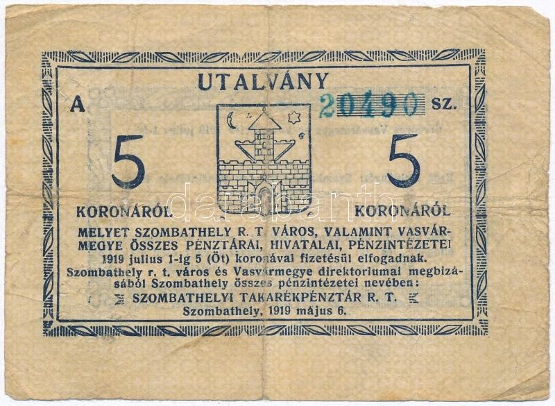 https://www.darabanth.com/en/307-Online-auction/307.0/Numismatics/Emergency-Coins-and-Notes~300006/Szombathely-1919-5K-Szombathelyi-Takarekpenztar-RT-utalvany-TIII-~II1661038