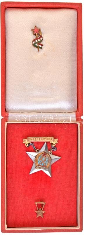 1951. "Sztahanovista" zománcozott fém kitüntetés tokkal, miniatűrrel + "MKP" zománcozott fém gomblyukjelvény (11x26mm) T:2,2-