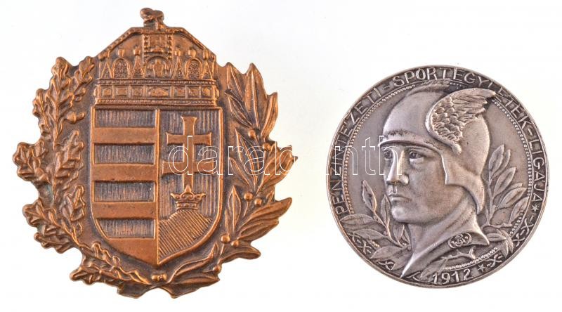Bakonyi Sándor (1892-1937) 1912. "Pénzintézeti Sportegyletek Ligája / Távolugrás III. o. I" ezüstözött fém díjérem (37mm) + DN Magyar címer, sérült Br jelvény (47mm) T:2