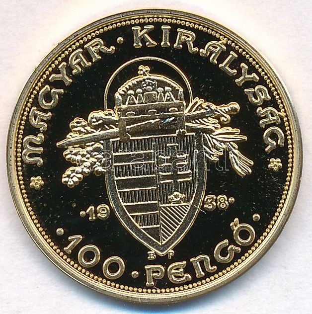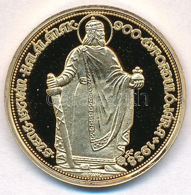 https://www.darabanth.com/en/307-Online-auction/307.0/Numismatics/Modern-restrikes-fantasy-coins~300010/DN-Magyar-aranypenzek-utanveretben--Szent-Istvan-jubileumi-100-pengo-1938-aranyozott-Ag-emle~II1660179
