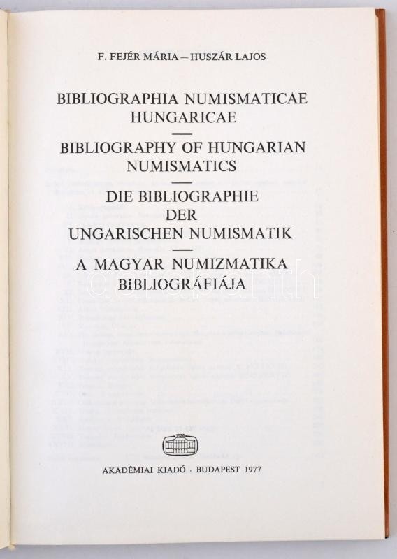 F. Fejér Mária - Huszár Lajos: Bibliographia Numismaticae Hungaricae. ... https://www.darabanth.com/en/307-Online-auction/307.0/Numismatics/Numismatics-Literature~300002/F-Fejer-Maria--Huszar-Lajos-Bibliographia-Numismaticae-Hungaricae-Budapest-Akademiai-Kiado~II1643482