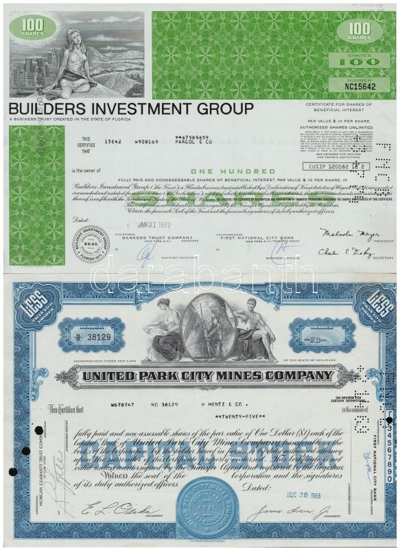 Amerikai Egyesült Államok 1958-1979. 10db-os vegyes részvény tétel, benne "CCI Corporation", "King's Department Store", "The Anaconda Company", "Abacus Fund", "United Park City Mines Company", "Massey-Ferguson Limited", "Builders Investment Group", "Studebaker-Worthington, Inc.", "Food Fair Stores, Inc.", "Jantzen Inc." nagyrészt bélyegzésekkel, perforációval érvénytelenítve T:II-,III USA 1952-1978. 10pcs of shares, including "CCI Corporation", "King's Department Store", "The Anaconda Company", "Abacus Fund", "United Park City Mines Company", "Massey-Ferguson Limited", "Builders Investment Group", "Studebaker-Worthington, Inc.", "Food Fair Stores, Inc.", "Jantzen Inc.", mainly with cancellations and invalidated with perforations C:VF,F